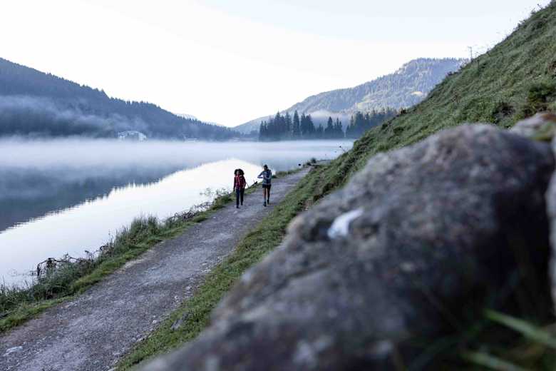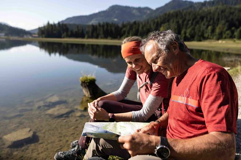 Die Alpenüberquerung beginnt am Spitzingsee in Bayern. Foto: Bergzeit, Hansi Heckmair Ein Blick auf die Karte gibt gleich zu Beginn Aufschluss über den Wegverlauf der nächsten Tage. Foto: Bergzeit, Hansi Heckmair Die erste Etappe der Bergzeit Alpenüberquerung führt entlang des Spitzingsee. Foto: Bergzeit, Hansi Heckmair Bildergalerie (3)