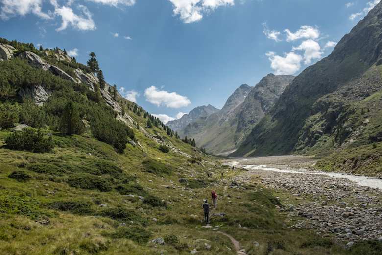 Nach der Auffahrt mit dem Ötztaler Wanderbus bis kurz vor das Gasthaus Fiegl wandern wir in das schöne und stille Windachtal hinein. Der Wanderweg in dem breiten Tal steigt hier nur mäßig bergan. Wir passieren die Materialseilbahn zur Hildesheimer Hütte und lassen den Abzweig links liegen. Das Tal wird nun enger, der Weg steigt aber immer noch relativ gemächlich an. Aus dem breiten Fahrweg ist längst ein Steig geworden. Wir kommen schließlich zur Talstation der Materialseilbahn der Siegerlandhütte. Bereits hier ist viel von der Ursprünglichkeit des Windachtales zu spüren.