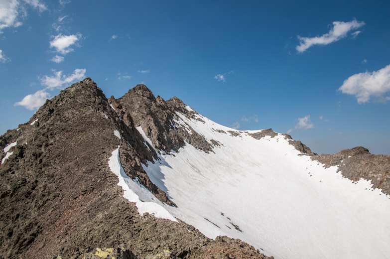 Der Steig führt nun in zahlreichen Kehren über Blockwerk bergauf in ein Kar. Über weiteres Blockwerk und im Frühsommer einige Schneefelder leiten die guten Markierungen hoch zum Nordostrücken. Über diesen steigen wir hoch zu einem Vorgipfel. Nun sehen wir erstmals den Gipfel des Hohen Seeblaskogels. Leider müssen wir vorher noch einmal ein wenig hinab. Wir gehen am Grat weiter zu einer Einschartung, die uns zum Grünen-Tatzen-Ferner hinüber bringt. Nun queren wir am Gletscher unterhalb des Gipfels entlang in eine Einsattelung rechts vom Gipfel. Über den Blockgrat steigen wir hoch zum Gipfelkreuz auf dem Hoher Seeblaskogel.