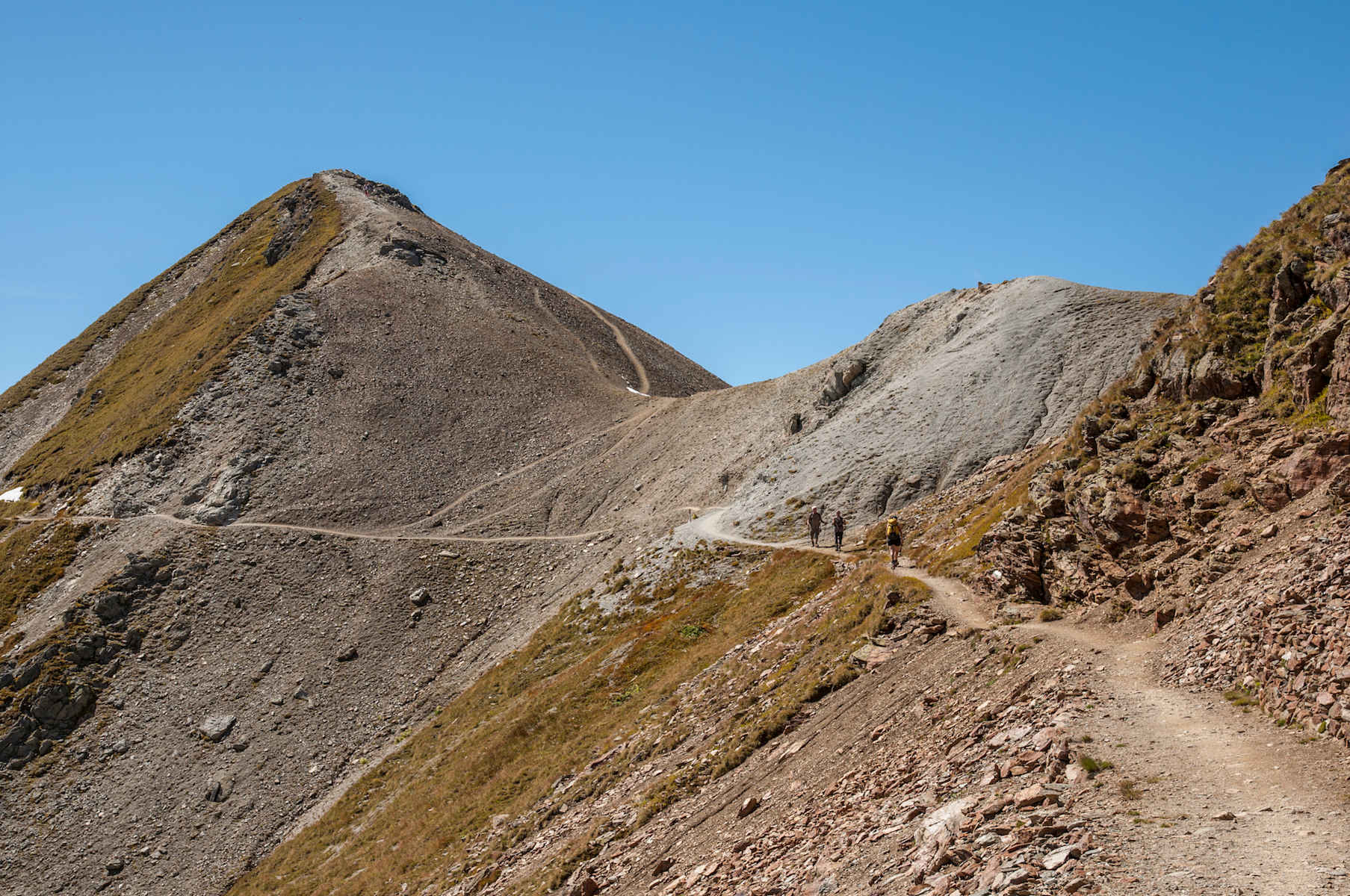 Nach unserer Gipfelrast gehen wir am Anstiegsweg wieder hinunter in die Einsattelung unterhalb der Rötlspitz. Auf dem Goldseeweg wandern wir nun weiter in Richtung Stilfser Joch. Unterhalb einer weiteren kleinen Erhebung zieht der Weg nun hinüber zur Dreisprachenspitze und weiter zum Stilfser Joch, an dem nach der schönen Stille am Goldseeweg nun geschäftiger Tourismus überrascht. Am Stilfser Joch steigen wir in den Bus (Achtung eingeschränkter Fahrplan im Herbst), der uns über die kurvenreiche Stilfser-Joch-Straße zurück nach Trafoi bringt.