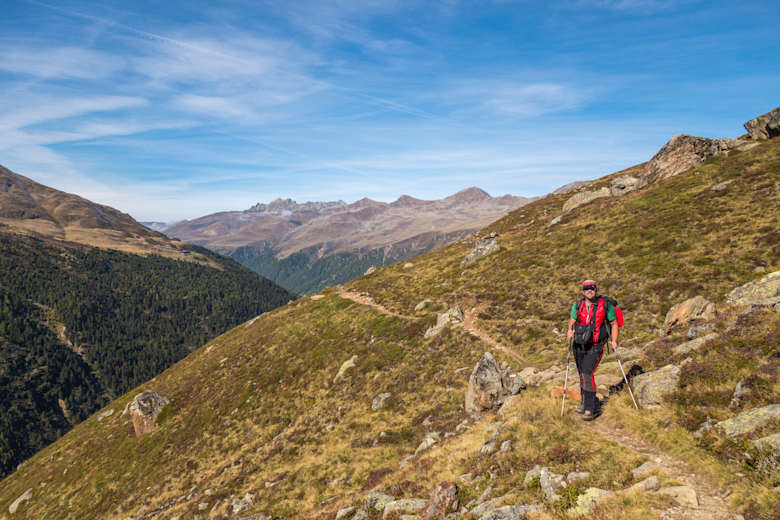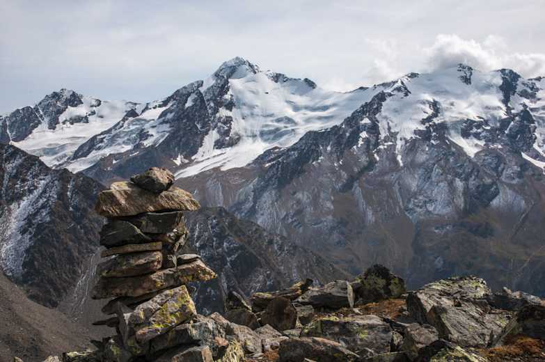 Hier beginnt nun der aussichtsreiche Höhenweg, der am ganzen Hang entlang bis zur Schafberghütte führt. Immer wieder bleiben wir stehen und genießen die wunderbare Aussicht auf die eindrucksvollen Gletscher der Weißkugel. Unweit der Schafberghütte befindet sich an einem Wegkreuz eine Bank. Hier setzen wir uns erst einmal hin, gönnen uns eine Pause und genießen die stille Bergwelt.