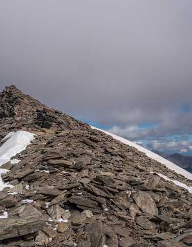 Vor dem See müssen wir bereits vom Hauptweg abbiegen und folgen den Markierungen auf der linken Seite des Sees. Über einen Rücken gehen wir kurz aufwärts, bevor der Weg nochmals kurz an Höhe verliert. Hier passen wir auf, dass wir die Markierungen nicht verlieren. Unser Weg zieht nach links, während Steinmänner und Steigspuren geradeaus weiter führen. Über sehr steiles Gelände steigen wir teilweise etwas mühsam hinauf zum Südwestgrat. Dieser bringt uns nun wieder deutlich flacher in Richtung des Gipfels. Zum Schluss wird der Grat etwas blockiger, wir gehen aber ohne besondere Schwierigkeiten hinauf zum Gipfel des Upiakopfes.