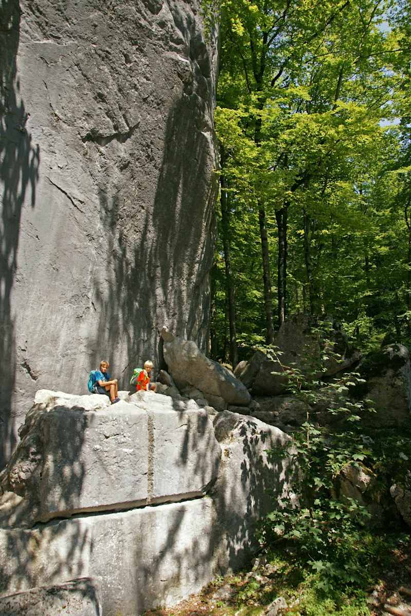 Nach einer ausgedehnten Rast in dieser wahrlich außergewöhnlichen Umgebung führt uns die Rundtour zurück zum Plombergstein-Sattel, wo wir uns nun rechts halten und Richtung St. Gilgen marschieren. Auf dem Weg zu den Steinklüften steigen wir einen steilen Pfad zuerst in nördlicher und anschließend in südlicher Richtung bergab. Nun ist es nicht mehr weit bis zu den Steinklüften. Anfangs nehmen uns die mächtigen, senkrecht in die Höhe ragenden Wände des Plombergsteins in Empfang, neben denen wir uns wie Zwerge in einer Welt von Giganten fühlen. Links den rot-weiß-roten Weg entlang, stoßen wir mitten im Wald auf eine wild zusammengewürfelte Ansammlung größerer und kleinerer Felsbrocken, welche sich im Laufe der Zeit gelöst haben und die Wände heruntergestürzt sind. Für Kinder stellt diese Umgebung ein Paradies zum Klettern und Kraxeln dar – wir sollten allerdings darauf achten, dass es dabei nicht zu hoch hinaufgeht!