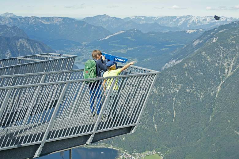 Um zu den berühmten „5 Fingers“ zu gelangen, gehen wir zurück bis zur Abzweigung und folgen danach der Beschilderung in nördlicher Richtung. Links kommen wir an einem steil abfallenden Hang vorbei, welcher sich als idealer Startplatz für Paragleiter herausstellt. Zahlreiche Bänke laden zum Verweilen ein und immer wieder werden wir auf die pechschwarzen Alpendohlen aufmerksam, die einen schmalen, aber markanten gelben Schnabel besitzen und die Wiesen bevölkern. Der asphaltierte Weg, der uns steil bergab führt, mündet in einen Schotterweg und kurz darauf kommen wir an interessanten Informationstafeln zur Geologie des Dachsteingebirges vorbei. Mit dem Erreichen der Aussichtsplattform „5 Fingers“ haben wir einen herrlichen Blick auf den Hallstättersee und die Welterberegion (siehe Freizeittipp E11).