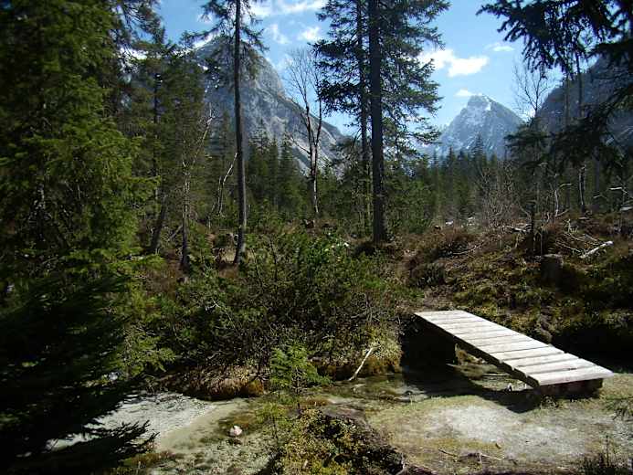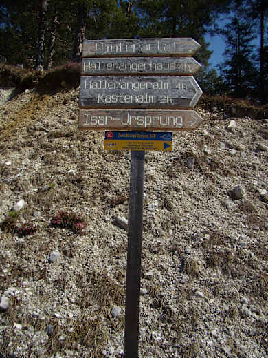 An der Wegverzweigung hält man sich links und folgt wieder dem Lauf der Isar, die hier viel Platz hat. Der Weg 224 führt immer weiter hinein ins Tal bis man schließlich einen interessanten Punkt erreich: ein Wegweiser deutet auf den Isar-Ursprung hin. Der kleine Abstecher lohnt sich und über Holzstege gelangt man tatsächlich zur kristallklaren Quelle, aus der die Isar entspringt.