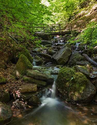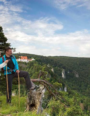 Bald das erste Hinweisschild zum „Fürstlichen Park Inzigkofen“. Nach weiteren Felsen links steil bergauf. Erst auf schmalem Weg, dann führen Treppen direkt zu den Felsen. Auf spannendem Weg bis an die Kante. Wer möchte, der kann kurz vorher links einen Abstecher zu den Grotten machen und auf demselben Weg zurück. Oben dann links am Hang entlang bis zum Aussichtspunkt „Känzle“. Das Donautal liegt dem Wanderer zu Füßen. Zurück in den Wald, nach wenigen Metern an einem Feldkreuz die Straße überqueren. Auf schmalem Weg unterhalb der Straße über einen Holzsteg und ein Felsloch. Dahinter überspannt die Teufelsbrücke eine kleine Schlucht.
