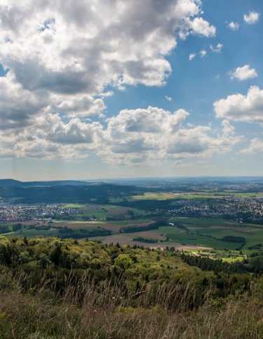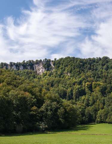 Die letzten Meter des Waldwegs hinauf zum betretbaren Portal der Höhle sind noch einmal steil, genau wie auch die folgenden Kehren, die zu einer Lichtung führen. Auf einem Wiesenpfad spazieren wir entlang des Waldrands, bis wir kurzzeitig einem Wirtschaftsweg nach rechts folgen. Weiter geht es links über die Albhochflächen des Hirschplatzes, ehe wir im Wald absteigen und zum Kunstmühlefels gelangen. Dort genießen wir die schöne Aussicht über das Seeburger Tal und die umliegenden Felsen. Wir folgen einem schmalen Naturpfad nach Norden über den Hochberg, passieren den gleichnamigen Felsen und werden entlang des Weges mit tollen Aussichten auf Bad Urach belohnt. Unser nächstes Zwischenziel ist der Aussichtspunkt Michelskäppele, an dem ein Holzpavillon Wanderern Schutz bietet. Der kehrenreiche Abstieg zurück zum Sportplatz erfordert noch einmal Trittsicherheit, doch schon kurz darauf haben wir es geschafft. Entlang einer Naturtribüne laufen wir zurück zum Wanderparkplatz Zittelstatt, unserem Ausgangspunkt.