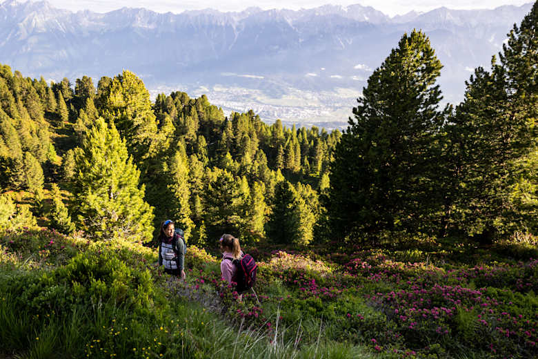Zur Almrosenblüte am Zirbenweg am Patscherkofel Foto: Innsbruck Tourismus, Eye5 - Jonas Schwarzwälder