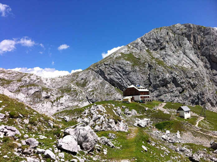 Im Juli 2014 wurde das 100-jährige Bestehen der gemütlichen Hütte gefeiert. Eingebettet zwischen dem felsigen Gipfelzug der Scheichenspitze und dem Sinabell, auf einem vorgelagerten grünen Hügel. Wunderschöner Aussichts- und wichtiger Wanderknotenpunkt! Da wäre zum Einen der Weg zum Dachstein Gletscher, die Überquerung des verkarsteten Hochplateaus Richtung Norden zum Krippenstein oder der Aufstieg zur Scheichenspitze und Ramsauer Klettersteig. Ab hier bewegt man sich in hochalpinem Gelände – entsprechendes Verhalten ist Voraussetzung für sicheres Wandern. Der Hausberg des Guttenberghauses ist der Sinabell. Der Gipfelanstieg dauert eine gute Stunde und wird auch als Abstiegsvariante vom Austria Klettersteig Sinabell genutzt.