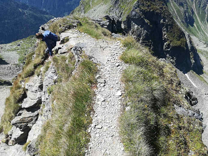 Der Abstieg über die Ostschulter zur Filzscharte, wobei Vorsicht geboten ist, kann als Alternative begangen werden. Es gibt Versicherungen, aber loses Gestein und abwärts geschichtete Platten erfordern volle Aufmerksamkeit. Von der Filzscharte aus gabeln sich 2 Wege: einer führt zur Hans-Wödl-Hütte, unser Weg Nr. 781 zweigt links ab und führt steil hinunter zum idyllischen Moaralmsee. Von dort (Weg Nr. 45) sehr viel entspannter entlang der Hänge unterhalb der Bärfallspitze bis zum Rossfeldsattel und über die Kaiblingalm auf gemütlichem Waldweg zurück zur Bergstation.