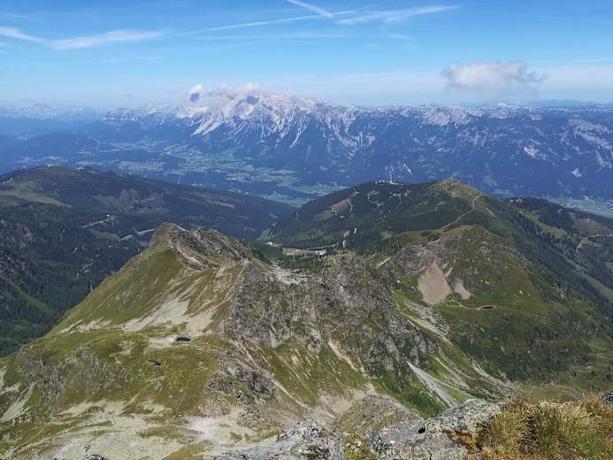 Das folgende Kar wirkt eher noch wilder und der Anstieg hinauf zur nächsten Scharte über Schutt und Geröll ist steil und zum Teil versichert. Danach quert man an der Südseite zur Kaltenbachschulter und steigt über Felsstufen am Westgrat zum Gipfel auf. Die freie Lage oberhalb des Ennstales und die Umrahmung durch die höchsten Gipfel der Schladminger Tauern sorgen für ein großartiges Panorama. Der normale Rückweg erfolgt über die Anstiegsroute zurück zur Seilbahn. Markierung: Weg Nr. 780 Höchstein.