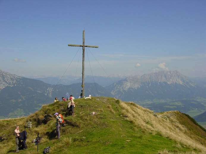 Sehr viel sanfter windet sich nun der Steig an den Waldhängen entlang bis zum Kniepass, wo der Weg von der Kleinsölk kommend einmündet. Nun wird es wieder steil. Durch eine Rinne führt nun der Steig in vielen Serpentinen über die Waldgrenze hinauf auf einen Felsrücken, bestehend aus Sölker Marmor, und weiter bis zum großen Gipfelkreuz. Man wird mit einer prächtigen Aussicht belohnt, speziell zu den einsamen Gipfeln im Naturpark Sölktäler.