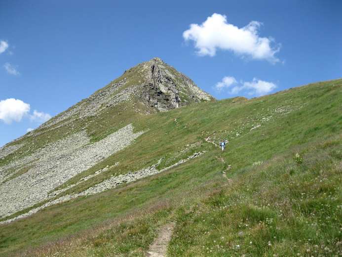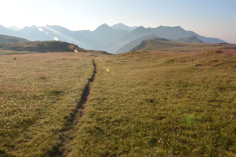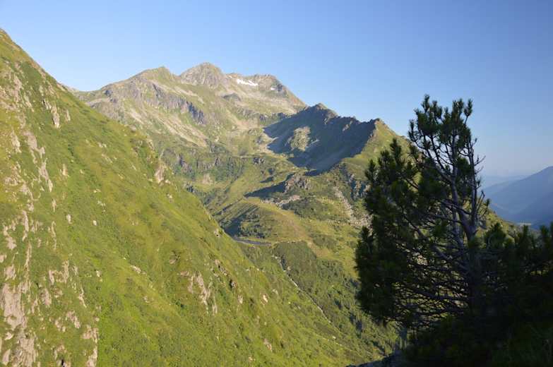 Ein gischtender Bach ist der nächste Anhaltspunkt, denn dort führt der Steig über eine kurze, aber steile Felsschulter hinauf zu den Etrachböden. Das ist eine sanft gegliederte weite Hochfläche mit einem herrlichen Rundumblick in die Gipfelwelt der Tauern. Der Tiefblick hinunter zu den Seen u. den markanten Straßenkehren der Sölkpaßstraße ist eindrucksvoll u. zeigt deutlich den schon überwundenen Höhenunterschied. Hier oben lässt es sich aushalten; kleine Bächlein durchschneiden die Wiesen, die von sanften Kuppen gegliedert werden. Gipfelstürmer folgen den Steigspuren auf den rechten Kamm, steigen noch einmal kurz in eine Senke ab, queren schrofiges Gelände (markiert) und steigen an der Südwestseite auf zum großen Gipfelkreuz.