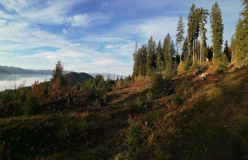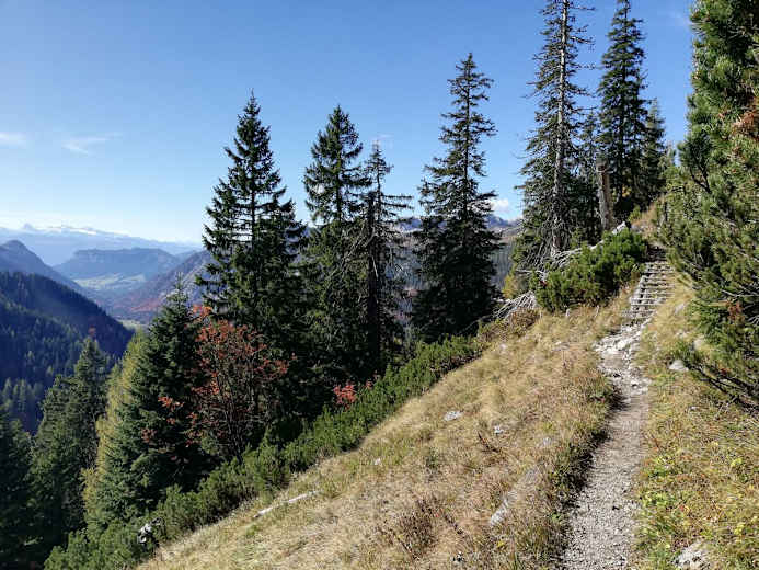 Kurz nach der Alm und dem dahinterliegenden Gatter wendet man sich rechts und wandert über einen steileren Steig bis zum "Gott-sei-Dank-Bankerl". Hier sollte man den herrlichen Ausblick genießen, ehe man rechts weg, diesmal flach, zur bewirtschafteten Hochmölbinghütte geht.