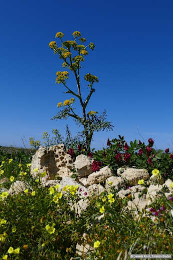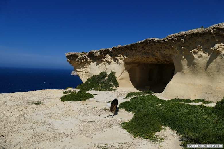 Wir folgen dem Weg an den Jagdunterständen vorbei, parallel zur Küste, mit tollen Ausblicken zur Bucht von Xlendi im Osten. Schließlich erreichen wir Wardija Point. Der Weg schlängelt sich am Rand der Felder zu einem großen Felsbrocken empor. Direkt vor dem Felsen gehen wir links durch eine Lücke in der Mauer (der punische Tempel – eine in den Fels gegrabene Höhle mit Nischen – liegt wenige Meter unterhalb in Richtung Meer). Wir umgehen den Felsen auf der linken Seite und sehen die Dwejra Bucht mit dem Fungus Rock. Jäger haben hier für die Wanderer Pfeile aufgemalt, um sie während der Jagdsaison schnell und sicher durch ihr Jagdgebiet zu führen. Dann halten wir uns links, nahe der Küste.