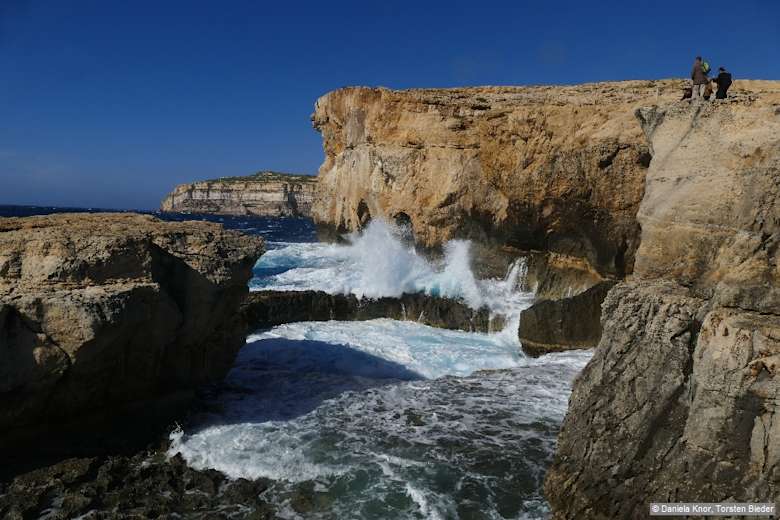 Die größte Attraktion der Dwejra Bucht, das Azure Window, ist in einem Sturm am 8. März 2017 vollständig ins Meer abgestürzt. Foto: Daniela Knor, Torsten Bieder, Rother Bergverlag