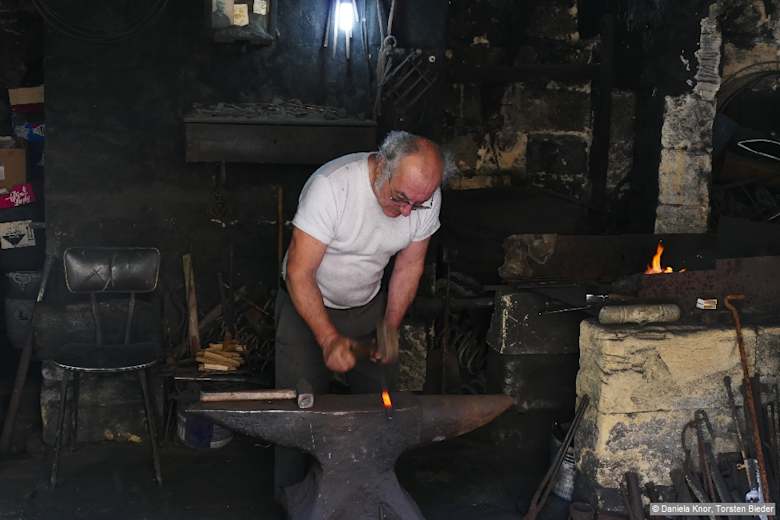 In der rußgeschwärzten Schmiede in San Lawrenz wird noch dem alten Handwerk nachgegangen. Foto: Daniela Knor, Torsten Bieder, Rother Bergverlag