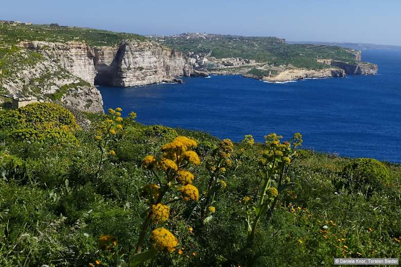 Auf dem Weg entlang der Klippen in Richtung Dwejra Bay ergeben sich wunderbare Ausblicke. Foto: Daniela Knor, Torsten Bieder, Rother Bergverlag Bildergalerie (9)