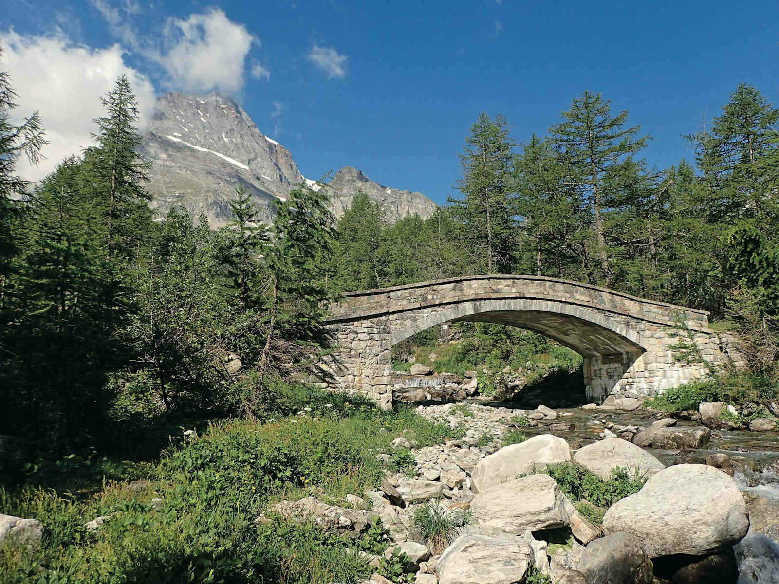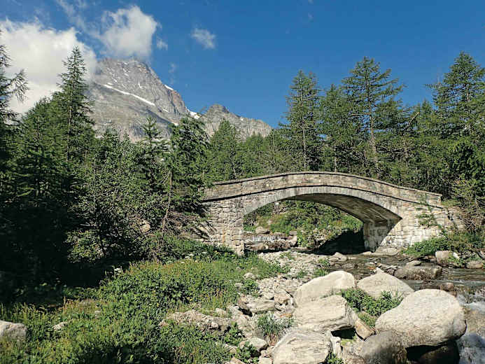 Die Brücke am Eingang zur Alpe Veglia, hinten der Monte Leone. Foto: Tim Shaw, Rother Bergverlag Bildergalerie (4)