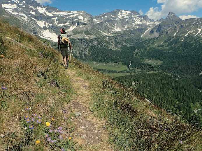 Es folgt ein etwas steilerer Aufstieg zu einem Aussichtsplatz, von dem wir sowohl die Alpe Veglia als auch das Val Cairasca bewundern können. Wir wandern auf einem Höhenweg weiter und biegen kurz vor einer Rippe rechts ab (Schilder). Nach einem nur anfangs steilen Abstieg kommen wir an ein paar Hütten vorbei und treffen auf die Forststraße von Ciamparino, der wir bis hinunter nach San Domenico folgen.
