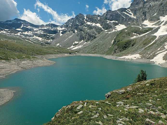Panoramaplatz über dem türkisblauen Stausee Lago d’Avino. Foto: Tim Shaw, Rother Bergverlag