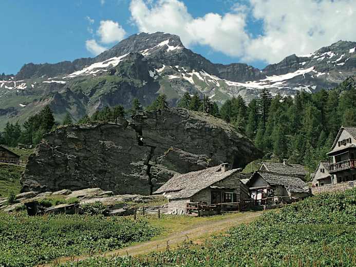 Das folgende Stück ist etwas unübersichtlich und wir müssen genau auf die Markierungen achten. Das Gelände ist jedoch einfach, und wir gelangen über Wiesen rasch zur Hochebene der Alpe Veglia und dem Weiler Cornù, 1.743 m, mit dem Ristorante Lepontino, hinter dem wir, vorbei an der Alpenclubhütte, nach La Balma, 1.785 m, mit dem charakteristischen zerborstenen Felsen aufsteigen.