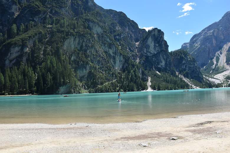 Am Seerundweg weiter erreicht man nun aber das Südende des Sees, das durch flache Kiesbänke geprägt wird. Durch lichten Wald wandert man weiter und wendet sich nach links. Damit verlässt man nun auch den Dolomiten-Höhenweg und wendet sich dem steileren Ostufer des Pragser Wildsees zu. An einer Felswand geht der Weg in eine Treppe über und in zwei Kehren steigt man auf dem gestuften Weg aufwärts bis zu einer tollen Aussichtsplattform mit Bänken.
