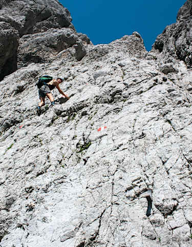 Ein roter Pfeil (nicht übersehen!) weist nach links über einen Felsen, den man beherzt überkraxelt. Auf der rechten Seite der Rinne plagt man sich steil und ausgesetzt durch das Felsengelände hinauf. Noch deutlich unter der Grathöhe eine Rinne nach links queren und durch einen breiten Felsenriß gegen Nordosten zum Gipfelkreuz hinauf.