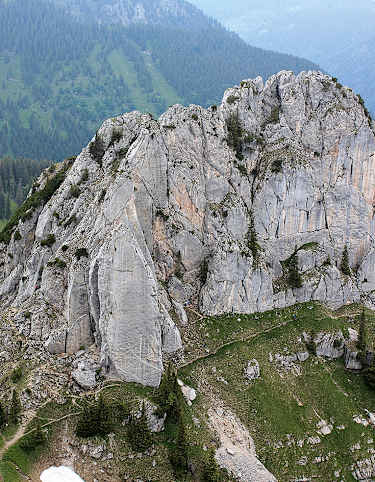 Und dann braucht man starke Nerven. Vom Sattel ein kurzes Stück nach Süden und an die Felsen heran. Mutig über die griffigen Kalkfelsen auf ein gutes Weglein, das sich durch Schutt und Geröll links haltend zum Grat hinaufschlängelt.Von dort über Trittspuren in die stark geneigte Flanke südwestlich des Grats. Über einen Gratausläufer hinweg und etwas abfallend durch Geröll an eine Steilrinne heran. Diese am unteren Rand queren. Dort beginnt das anspruchsvollste Stück der Tour.