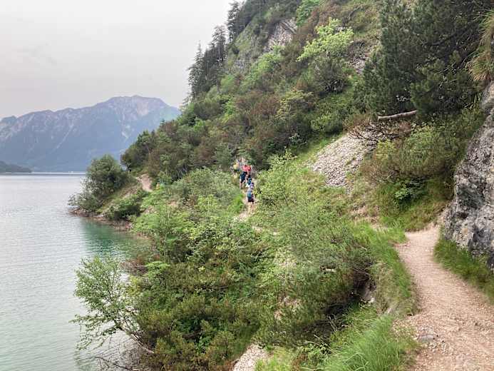 Bis Pertisau ist der Weg einfach und kinderwagentauglich. Dann führt er über einen Schotterweg weiter, vorerst immer noch eben, später als schmaler, teil seiversicherter Steig wunderschön angelegt entlang des hier steil abfallenden Westufers des Sees. Immer wieder genießt man fantastische Blicke auf den tiefblauen See.