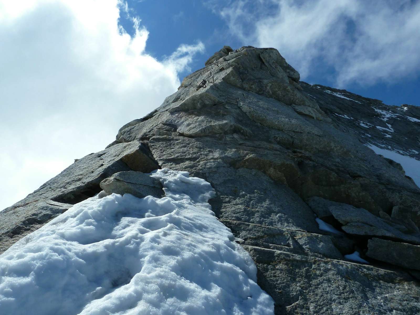 Rechter Hand beginnt nun der Nordgrat, der aus dieser Perspektive recht kurz aussieht. Meist stampft man hier noch einmal durch Schnee oder muss steil (35 Grad) über Eis aufsteigen bis man an den Felsen kommt. Am Felsgrat klettert man nun die letzten 250 Höhenmeter aufwärts. Zwei Stellen erreichen eine Schwierigkeit von III, der Rest spielt sich im II. Schwierigkeitsgrad ab. Ein paar Eisenklammern erleichtern den Anstieg.