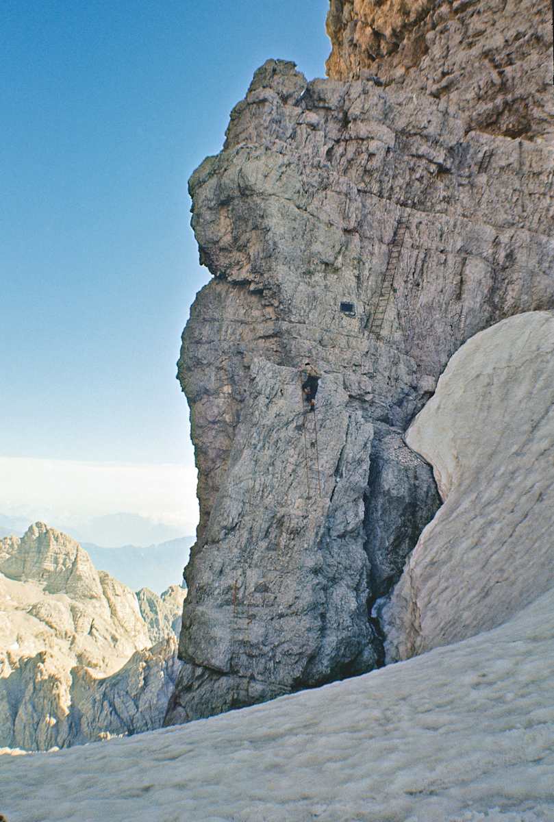 Unterhalb des Campanile Basso über Felsstufen und Geröll nach Süden abwärts, zuletzt kurz nach rechts empor in die Bocchetta del Campanile Basso, 2.620 m, zwischen dem Turm und der Cima Brenta Alta. Jenseits an der Brenta-Alta-Nordwand (Drahtseile, Leitern, Klammern), eine Rinne querend, gegen das Val Brenta Alta hinunter, dann nach links in die Westwand des Berges. Dort auf teils überdachtem Band (Drahtseil; Blick in die Wände der Cima Tosa und des Crozzón!), an zwei Unterbrechungen vorbei, nach Süden, zuletzt an Leitern nach rechts hinab zum Wandfuß. Über Blockwerk (meist Schneereste) kurz nach Süden empor in die Bocca di Brenta, 2.552 m, zwischen Cima Brenta Alta und Cima Brenta Bassa. Jenseits durch eine Geröllrinne abwärts, dann auf dem Felsband rechts der Rinne quer durch die Cima-Brenta-Bassa-Ostwand zum Rifugio Pedrotti, 2.491 m, am Sattel (Passo del Rifugio) zwischen Cima Brenta Bassa und Croz del Rifugio.