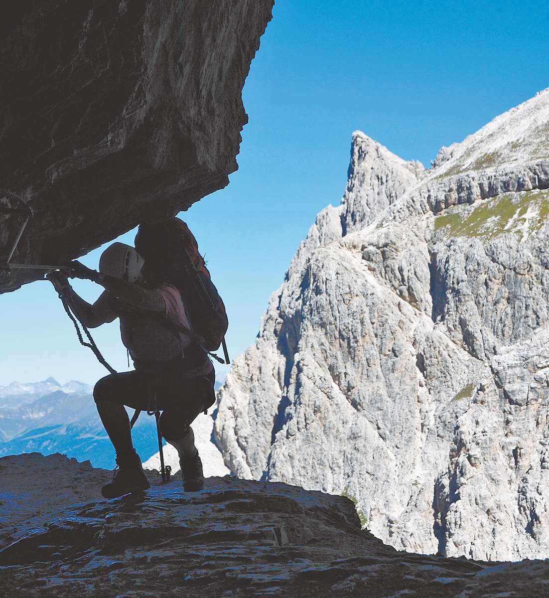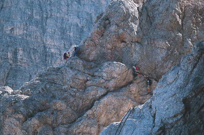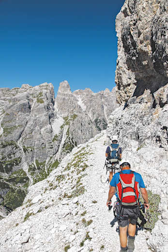 „Strada degli Alpini“ – so nennen die italienischen Bergfreunde diese atemberaubende Traverse durch die Steilflanken des Elfers. Eine Straße im herkömmlichen Sinn darf man zwar beileibe nicht erwarten, doch wie kühn und dennoch komfortabel die Soldaten hier während des Ersten Weltkriegs trassiert haben, ist schon bemerkenswert. Die ausgesprengten und später gesicherten Bänder erlauben ein zügiges Vorankommen, ohne die adrenalinfördernde Ausgesetztheit vermissen zu lassen. Als echter Traumpfad zählt der Alpinisteig nicht umsonst zu den populärsten Routen seiner Art und lässt sich mit der Ferrata Roghel und der Cengia Gabriella zur Galatour rund um den Elfer verbinden.