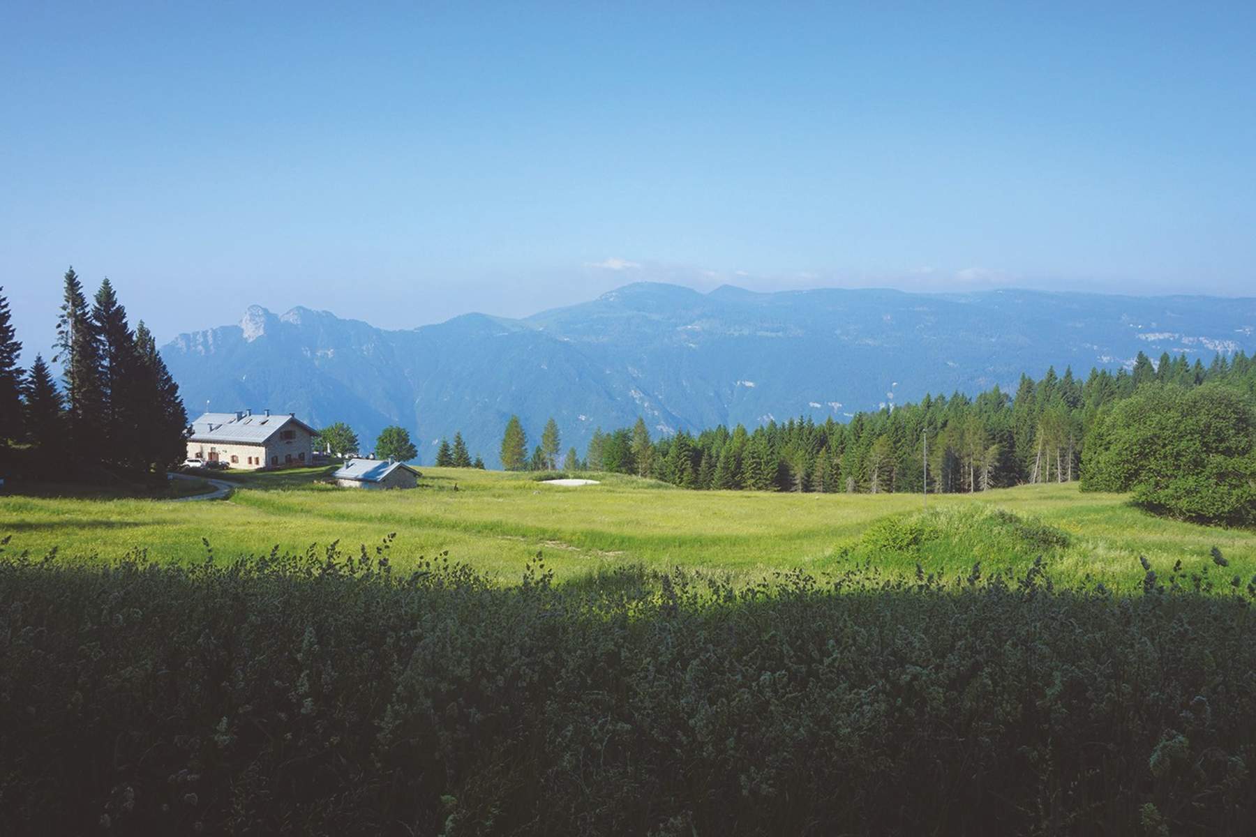 Wir laufen anschließend links an der Anlage vorbei und folgen den Beschilderungen „Malga Millegrobbe di sopra“ links den Fahrweg hinab. Nach etwa 20 Min. trifft der E5 auf den Fahrweg und 100 m später – zur Malga Millegrobbe links hinab – biegt der SdP rechts in einen Weg in den Wald ab. Keine 30 Min. später wandern wir an einer Ruine vorbei, queren die Straße und folgen dem SdP auf der anderen Seite weiter. Hier treffen wir auf ein verfallenes Lazarett, das im Ersten Weltkrieg dazu diente, die Kranken hinter der Front zu versorgen. Wir gehen an einem Picknickplatz und einem Militärfriedhof vorbei, ehe unser Weg an der Passstraße endet. Auf ihr gelangen wir bergan in 10 Min. zum Passo Vezzena, 1.421 m.
