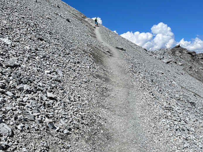Vom Zollhaus am Umbrailpass folgt man dem markierten Weg, der anfangs recht gemütlich über die grünen Ausläufer des Piz Umbrail führt. Dabei kommt man immer wieder an Relikten aus dem 1. Weltkrieg vorbei, Informationstafeln geben wissenswerte Einblicke.