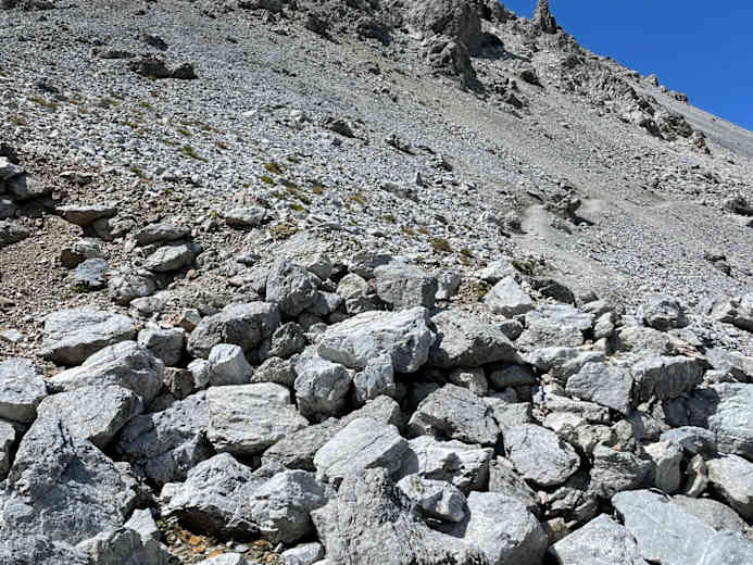 Schon bald wird aus dem gut zugehen Pfad ein steiniger, schlottriger Bergweg, der auf die Feslzone des Gipfels zuhält. Am Übergang in den Felsen erleichtert eine Kette das Vorankommen, Trittsicherheit ist hier aber jedenfalls erforderlich - vor allem im Abstieg! Auf dem Nordwest-Rücken erreicht man schließlich den sehr aussichtsreichen Gipfel.