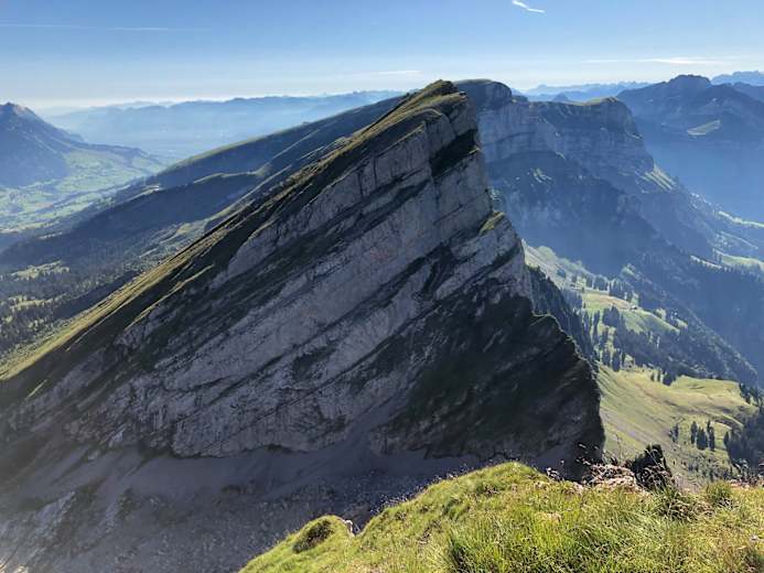 Entlang des Wanderwegs gelangt man auf den Schibenstoll (2.235 m). Man folgt den Wanderweg hinunter bis auf ca. 1.800 m und geht dann weglos über Geröll, Wiesen und Karstfelder nach Osten ins Gluristal, durch welches man aufsteigt, bis man den Wanderweg erreicht, der zum Hinterrugg (2.306 m), dem höchsten der sieben Churfirsten, führt. Leicht absteigend erreicht man bequem den Chäserrugg (2.261 m).