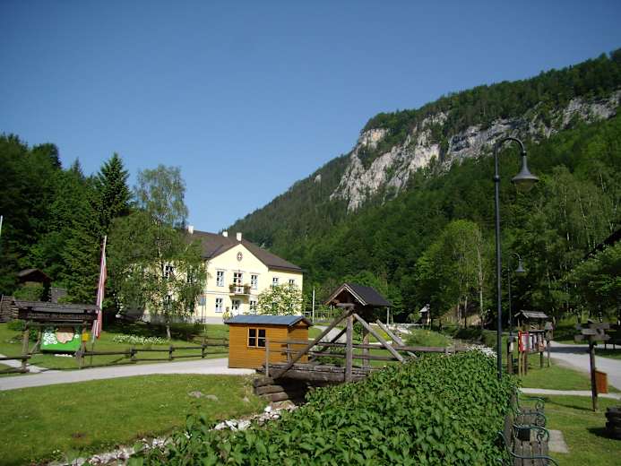 Vom Parkplatz bei der Talstation der Raxseilbahn geht es hinein ins Höllental. Der 1. Wiener Wasserleitungsweg führt relativ flach entlang der Schwarze in das Tal. Dabei sind immer wieder schöne Blicke auf den grünen Bach und die imposanten Felsformationen des Höllentales möglich.