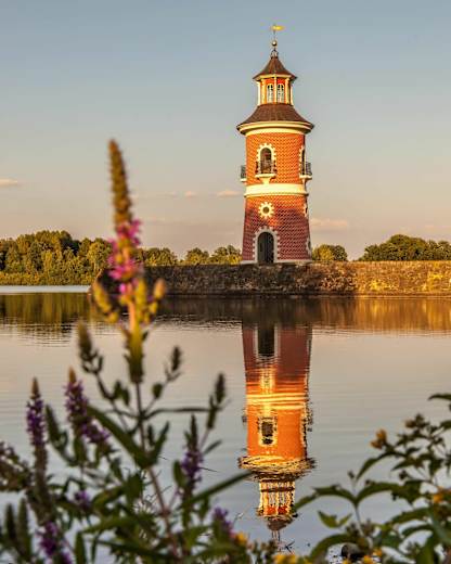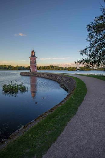 Im letzten Teil der Wanderung führt der Königsweg in einen Landschaftsgarten mit dem Fasanenschlösschen, das wegen der kompletten Hofhaltung auf kleinstem Raum auch als „Paradies in der Nussschale“ bezeichnet wird. Als Sommerschlösschen im Rokoko-Stil auf einer Anhöhe erbaut, bildet es im Zusammenspiel mit Leuchtturm, Hafen und Großteich ein einzigartiges Landschaftsambiente, dass die hier gefeierten opulenten höfischen Feste erahnen lässt. Rastmöglichkeiten laden auch heute zum Verweilen ein.