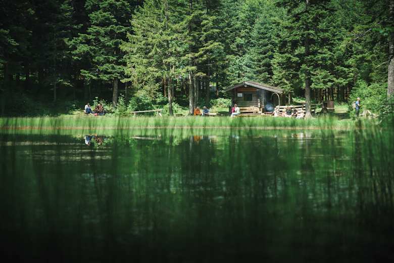 Links geht es weiter zum Forstseeli. Der Artenreichtum der Moorlandschaften und der idyllische See machen dieses Zwischenziel besonders reizvoll. Die offizielle Feuerstelle lädt zur Rast ein und wer hat, der brät hier seine selbst mitgebrachten Würstel.