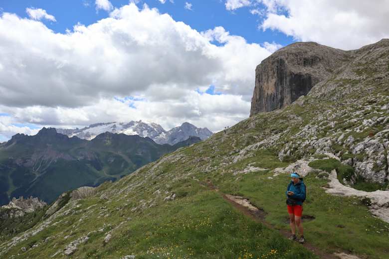 Nach einer Rast bei der Boèhütte folgt man der Markierung Nr. 638 ein und steigt durch eine kurze, aber ziemlich steile Rinne bis in die Forcella dei Ciaciadores hinauf. Hier trifft man auf den alpinen Steig Nr. 672, dem man bis zum Gipfel des Piz Boè folgt, auf dem das Schutzhaus Capanna Fassa in 3.152 m steht.