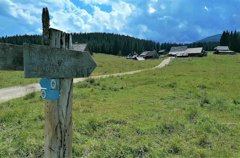 Alsbald umfangen uns geschlossene Waldabschnitte und sanfte Almen – wir nähern uns dem Gebiet der Pokljuka bzw. der Hochebene Rudno polje mit den militärischen Einrichtungen und der imposanten Biathlon-Sportanlage. Besonders aussichtsreich erleben wir die Uskovnica mit der Kapelle und der renovierten Hütte, den Blick nach Südwesten zur Bergkette „Bohinjsko-Tolminski greben“ sowie nach Nordwesten zum Triglav-Massiv.