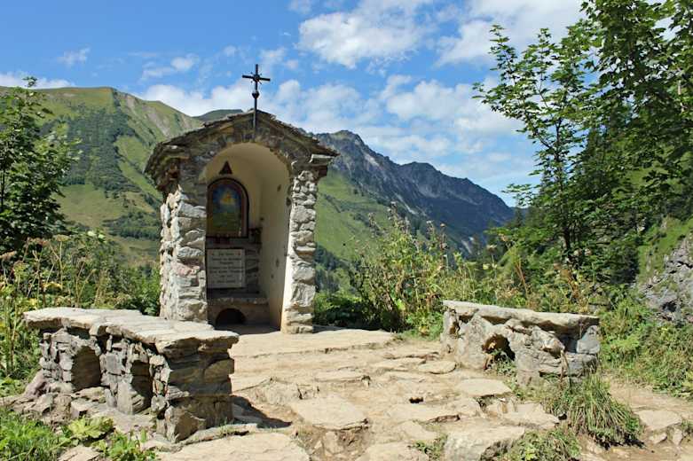Schließlich erreicht man die Kapelle Christi Geburt in Spielmannsau. Auf dem Wanderweg Nr. 438, der gleichzeitig auch der E5 und die Via Alpina Gelb ist, geht es nun anfangs noch gemütlich immer weiter taleinwärts. Vorbei an der Kapelle Maria am Knie steigt der Weg nun aber deutlich an und man wandert immer entlang des Sperrbachs zwischen den steiler werdenden Bergflanken aufwärts bis zur Kemptner Hütte auf 1.846 m. Damit hat man das erste Etappenziel erreicht.