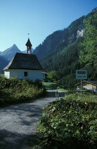 Entlang der Straße geht es nun weit ins Tal hinein bis zum kleinen Weiler Madau. Noch ein Stück weiter und man erreicht die Talstation der Materialseilbahn der Memminger Hütte. Bis hierher könnte man auch mit dem Taxi fahren.