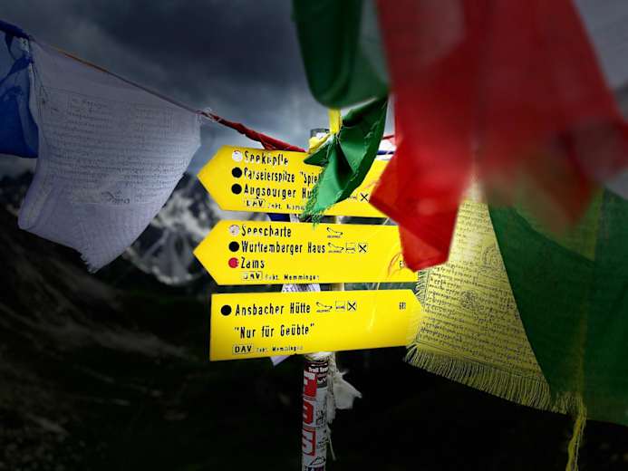 Wegweiser früh am Morgen bei der Memminger Hütte Foto: Oase AlpinCenter