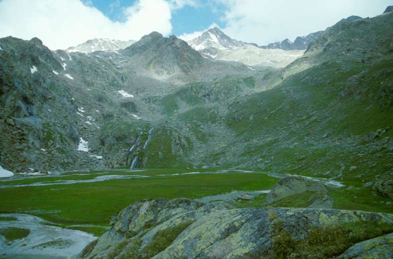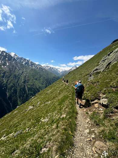 Von der Braunschweiger Hütte steigt man steil hinauf zum Pitztalerjöchl auf 2.996 m. Trittsicherheit und Schwindelfreiheit sind hier jedenfalls Voraussetzungen. Auf der anderen Seite führ der E5 hinunter bis auf den Parkplatz des Rettenbachferners. Hier steigt man in den Gletscherbus, der durch den Tunnel zum Tiefenbachferner fährt. Damit verlässt man nun den E5, der hinunter nach Zwieselbach führt.