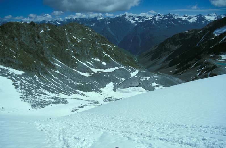 Blick von Pitztalerjöchl hinunter auf den Parkplatz des Rettenbachferners Foto: Christina Schwann, ökoalpin
