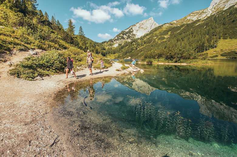 Wer aber den glasklaren, grün schimmernden See aus der Nähe erleben möchte, steigt etwa 100 Höhenmeter zu diesem ab und wandert an der Südseite des Steirersees entlang. Vorsicht, bei Nässe ist der Steig von den Steirerseealmhütten zum See hinunter oft feucht oder sogar selbst ein Bächlein! Nach gut 45 Minuten ist über diesen Weg der ruhige Schwarzensee erreicht.