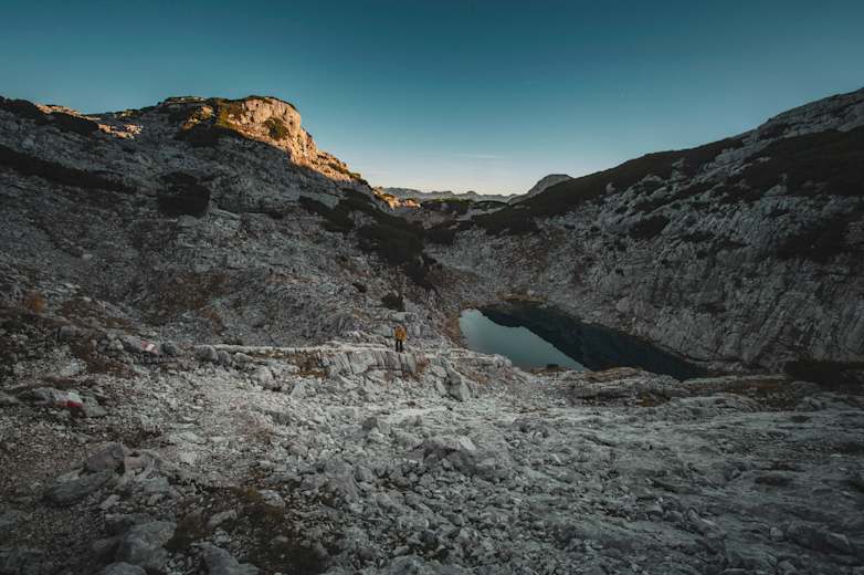 60 Höhenmeter steigt man nun vom Gipfel ab, bevor man im ständigen Auf und Ab über die Karstfläche weiter auf dem Weg Nr. 664 zum Heilbronner Kreuz wandert. Einsam und manchmal durchaus fordernd ist dieser Steig zwischen Latschen, Felsen und Dolinen. Gut möglich, dass hier in dieser Bergeinsamkeit das Dachsteinweibl bereits gesichtet wurde. Ist das Erinnerungskreuz erreicht, geht es wieder über einen breiten und geschotterten Wanderweg, vorbei am »Dachstein-Hai«, zurück zur Bergstation am Krippenstein.