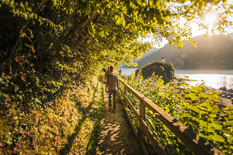 Gemütlicher Spaziergang im Ort Traunkirchen am Traunsee im Salzkammergut. Immer wieder laden Bänke ein, eine Rast mit Blick auf das Wasser einzulegen. Außerdem kommt man an der Johannesberg-Kapelle vorbei, in deren Eingangsbereich sich ein Kopf befindet - so groß sollen die Riesen in dieser Gegend einst gewesen sein.